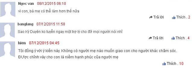 Đa số bài viết tỏ ra bất bình cho rằng Kỳ Duyên được mẹ quá nuông chiều, thậm chí nhiều người cho rằng cô sống ỷ lại, dựa dẫm vào mẹ. Nhưng ở một khía cạnh khác, không ít độc giả đã lên tiếng bênh vực cho hoa hậu và theo họ có lẽ công chúng đang làm quá mọi chuyện.