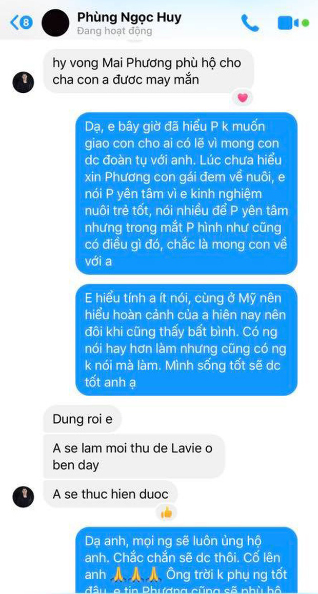 Tuy nhiên ngoài loạt tin nhắn với Vy Oanh, hiện Phùng Ngọc Huy vẫn chưa có bất cứ phản hồi nào với truyền thông hay trên trang cá nhân về chuyện nuôi dưỡng bé Lavie sau khi Mai Phương qua đời.
