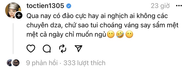 Nữ ca sĩ sinh năm 1989 còn tiết lộ sức khoẻ thời gian qua có vấn đề, luôn mệt mỏi: "Tôi choáng váng xây xẩm mệt mệt cả ngày chỉ muốn ngủ". Tuy nhiên sau đó cô cũng nhanh chóng lên tiếng đính chính luôn ở bài đăng là do "bà dì" ghé thăm, ngầm phủ nhận chuyện đang có tin vui: "Lâu lâu ốm thời tiết xíu mà đọc bình luận xong sợ quá khoẻ rồi, khoẻ ngay và luôn rồi ạ. Em bị 'dâu' hành thôi ạ". Động thái "rào trước" đáng ngờ này của Tóc Tiên càng khiến netizen bán tín bán nghi.