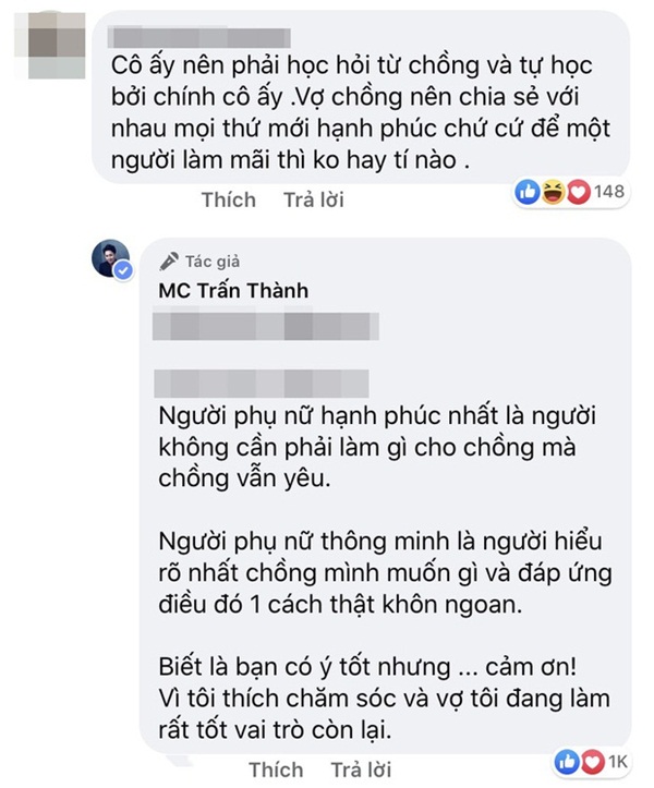 Dòng comment của nam MC nhận về nhiều sự đồng tình. Đa số cho rằng bà xã Trấn Thành là người luôn biết cách động viên, khen ngợi và ở cạnh chồng mỗi khi anh đứng bếp.