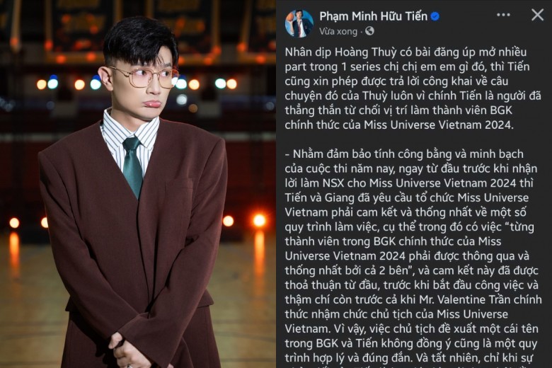 Tối 11/7, dân tình xôn xao khi Hoàng Thùy và Dược sĩ Tiến căng thẳng, "lời qua tiếng lại" tên mạng xã hội. Vụ việc bắt nguồn khi nữ siêu mẫu "úp mở" chuyện bị rời ghế giám khảo Miss Universe Vietnam 2024. Dù đã được mời họp, gửi lịch trình cuộc thi, tuy nhiên sau đó, cô bị ban tổ chức lại "gạch tên" vì một thành viên trong hội đồng giám khảo cho rằng cô không đủ năng lực ngồi cùng.