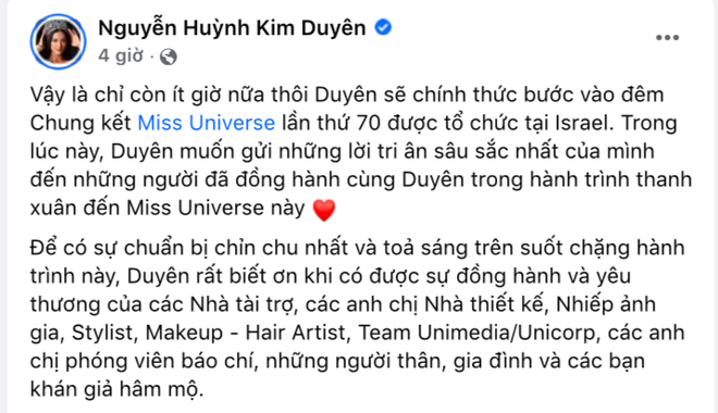 Sau hơn 2 tuần sang Israel, Kim Duyên đang chính thức bước vào chặng đua cuối cùng của Miss Universe 2021. Đúng 7 giờ sáng ngày 13/12 (giờ Việt Nam), hàng triệu khán giả đồng loạt hướng về Israel để ủng hộ và động viên tinh thần cho "chiến binh" Kim Duyên. Với nỗ lực 200% và luôn được đánh giá vào thứ hạng cao trong các bảng dự đoán, đại diện Việt Nam được đặt kỳ vọng sẽ làm nên chuyện.