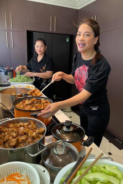 | Mẹ Trương Ngọc Ánh cũng phụ giúp con gái nấu cơm từ thiện. Phòng khách trong biệt thự của gia đình biến thành nơi chuẩn bị khẩu phần ăn. |