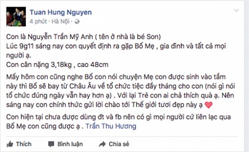 Mấy hôm con cũng nghe bố con nói chuyện mẹ con được sinh vào tầm này thì bố sẽ bay từ châu Âu về tổ chức tiệc đầy tháng cho con (nói gì nói tổ chức đúng ngày vẫn hay hơn ạ). Với lại trẻ con ai chả thích quà ạ. Nên sáng nay con chính thức gửi lời chào tới thế giới tươi đẹp này ạ. Con hiện tại chưa được dùng điện thaoij và Facebook nên có gì mọi người cứ liên lạc qua bố mẹ con cũng được ạ” - Tuấn Hưng hạnh phúc viết.