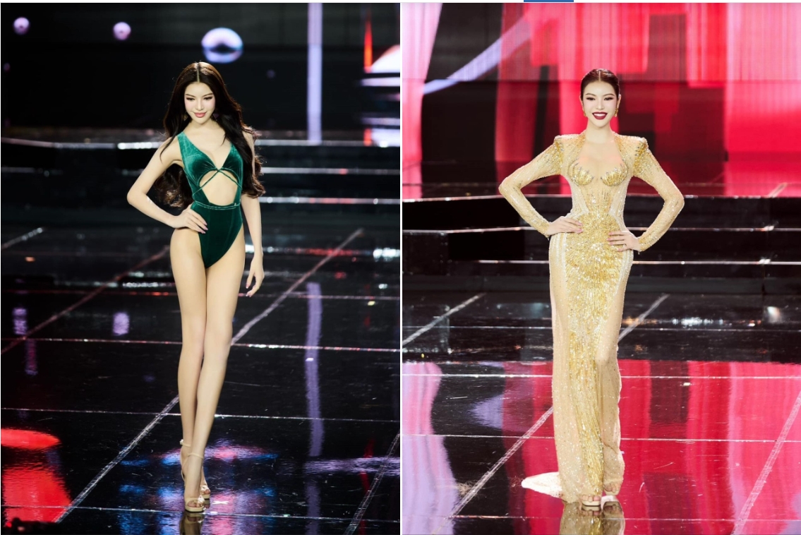 Ở vòng bán kết, Tường San khoe vóc dáng cân đối trong phần thi áo tắm và tỏa sáng với vẻ đẹp sang trọng trong bộ dạ hội ánh bạc của NTK Đỗ Long.