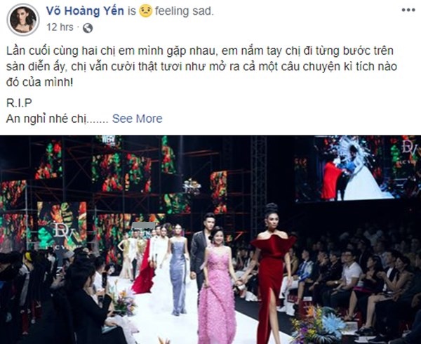 Đính kèm những bức ảnh cũ này, Võ Hoàng Yến bày tỏ: "Lần cuối cùng hai chị em mình gặp nhau, em nắm tay chị đi từng bước trên sàn diễn ấy, chị vẫn cười thật tươi như mở ra cả một câu chuyện kì tích nào đó của mình! R.I.P. An nghỉ nhé chị...".