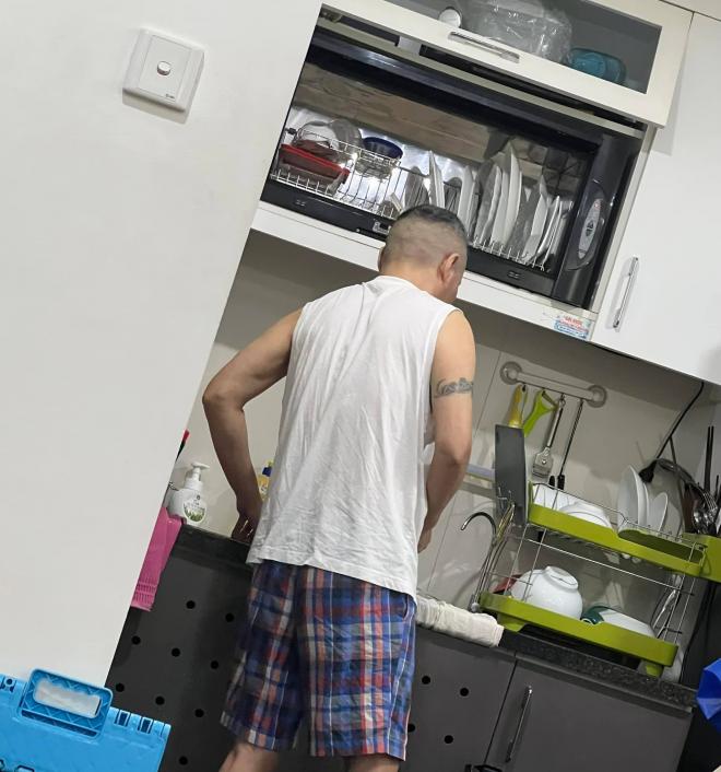 Công Lý lụi cụi rửa bát sau khi ăn khiến bà xã xúc động. Cô cho biết anh đã thay đổi khá nhiều sau khi khỏi bệnh.