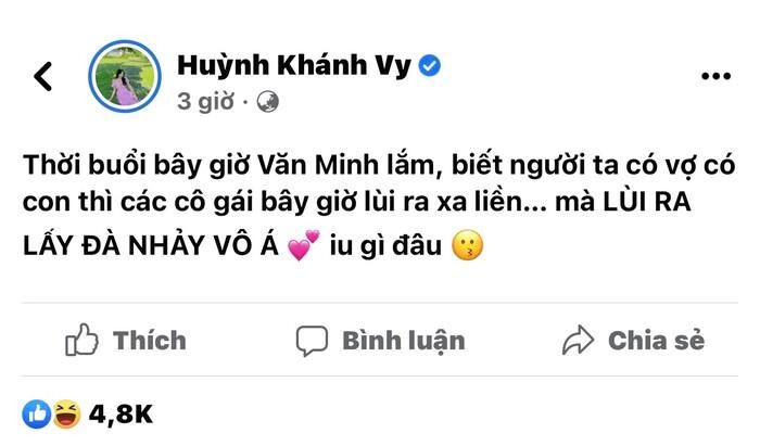 Trên trang cá nhân, Huỳnh Khánh Vy - bà xã Phan Mạnh Quỳnh đăng tải dòng tâm trạng bức xúc ẩn ý nhắc nhở ai đó. Cô viết: “Thời buổi bây giờ văn minh lắm, biết người ta có vợ có con thì các cô gái bây giờ lùi ra xa liền mà lùi ra lấy đà nhảy vô á. Yêu gì đâu”.