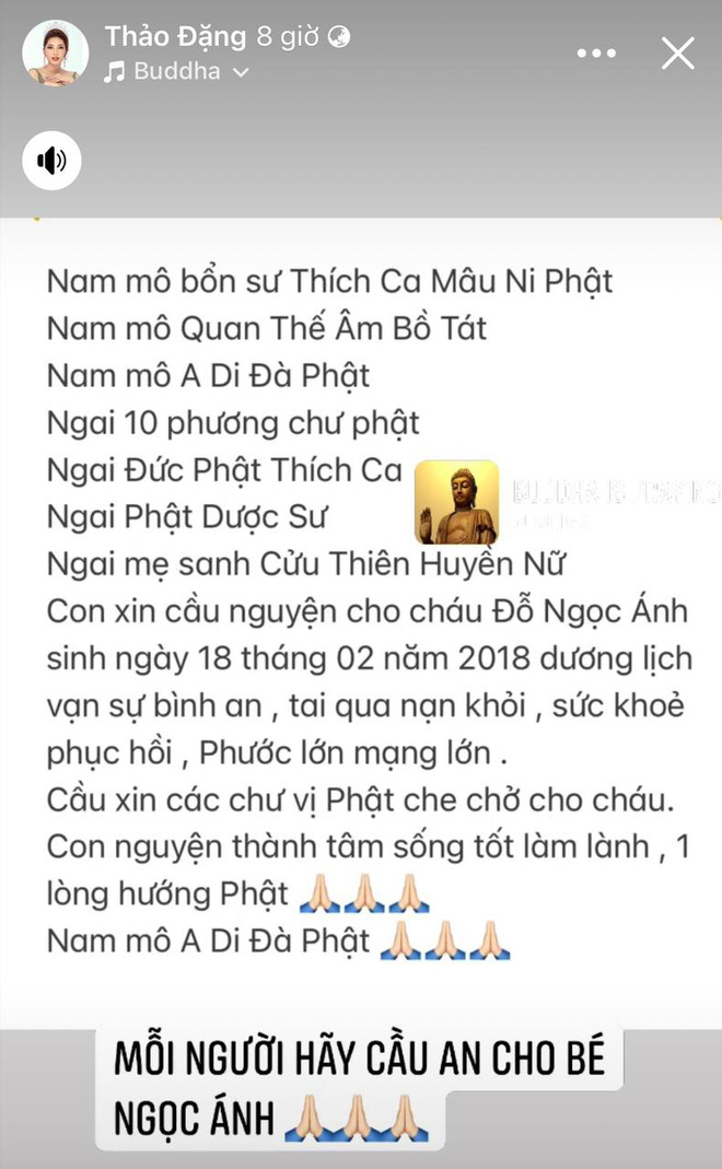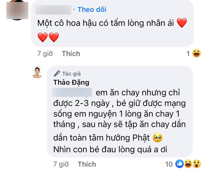 Trong khi đó, Hoa hậu Đại dương Đặng Thu Thảo lại chọn cách ăn chay hướng Phật để cầu nguyện cho em bé bị bạo hành sớm tai qua nạn khỏi. Hành động nhân văn của người đẹp được đông đảo khán giả ủng hộ.