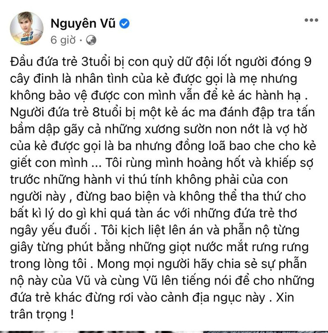 Ca sĩ Nguyên Vũ cũng không thể giữ được sự bình tĩnh khi hay tin em bé 3 tuổi bị ra tay tàn độc hết lần này tới lần khác. Nam ca sĩ bày tỏ: "Tôi rùng mình hoảng hốt và khiếp sợ trước những hành vi thú tính không phải của con người này, đừng bao biện và không thể tha thứ cho bất kì lý do gì khi quá tàn ác với những đứa trẻ thơ ngây yếu đuối. Tôi kịch liệt lên án và phẫn nộ từng giây từng phút bằng những giọt nước mắt rưng rưng trong lòng tôi. Mong mọi người hãy chia sẻ sự phẫn nộ này của Vũ và cùng Vũ lên tiếng nói để cho những đứa trẻ khác đừng rơi vào cảnh địa ngục này. Xin trân trọng!".