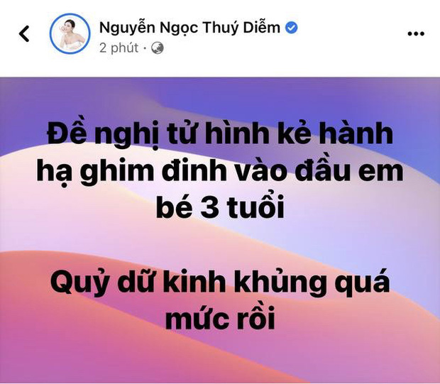 Là một người mẹ, diễn viên Thuý Diễm cũng phẫn nộ khi thấy bé gái bị bạo hành dã man: "Đề nghị tử hình kẻ hành hạ ghim đinh vào đầu em bé 3 tuổi. Quỷ dữ kinh khủng quá mức rồi".