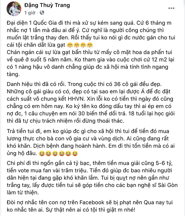 Không chỉ thế, Đặng Thuỳ Trang còn nhấn mạnh: "Nói tôi lừa đảo và kiện tôi ra hình sự. Tôi sẵn sàng làm rõ trắng đen thì bị kéo dài thời gian. Và mãi mới được cấp tờ giấy kết quả mà nó kiện tôi lừa đảo đây. Tất cả nợ là có thật và những gì nó kiện là sai hoàn toàn. Nó thừa nhận nợ nhưng không muốn trả lại trốn tránh lí do lí trấu". Thuỳ Trang tiết lộ cứ cách 6 tháng sẽ nhắc lại khoản nợ này 1 lần nhưng Thuỳ Tiên không hề có động thái trả lại.