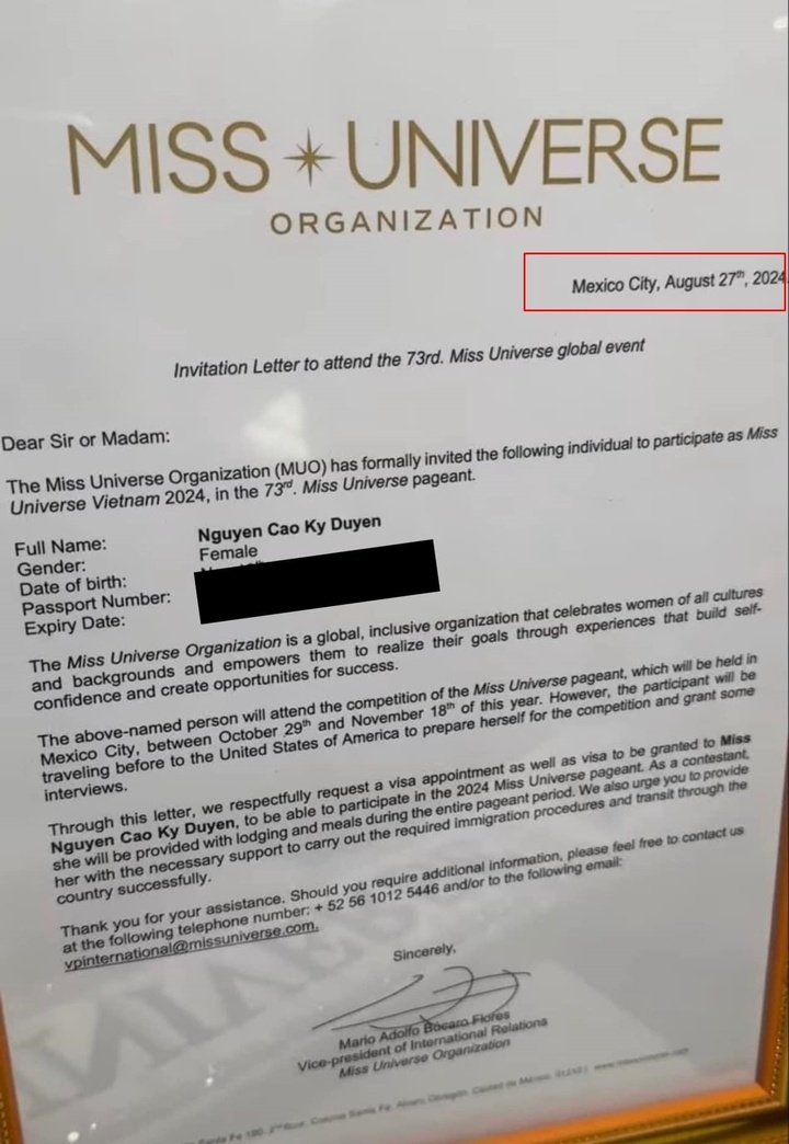 Thư mời tham dự Miss Universe 2024 của Hoa hậu Kỳ Duyên gây xôn xao dư luận.
