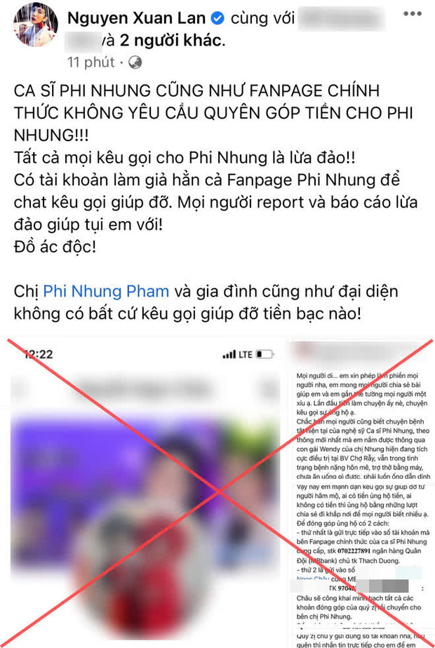 Giữa thời điểm nữ ca sĩ Phi Nhung đang được điều trị Covid-19, các trường hợp kẻ lợi dụng uy tín, danh dự và hình ảnh của người bệnh để lừa đảo tiền bạc đều gây phẫn nộ tột độ. Người hâm mộ nên cẩn trọng trước những thông tin kêu gọi liên quan đến ca sĩ Phi Nhung để tránh vướng "bẫy" của kẻ xấu.