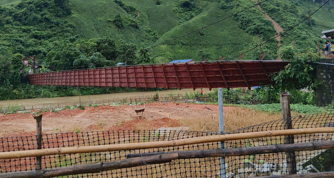 Đứt cáp cầu treo qua sông Nậm Núa, xã Thanh Yên, tỉnh Điện Biên. (Ảnh: Báo Điện Biên Phủ)