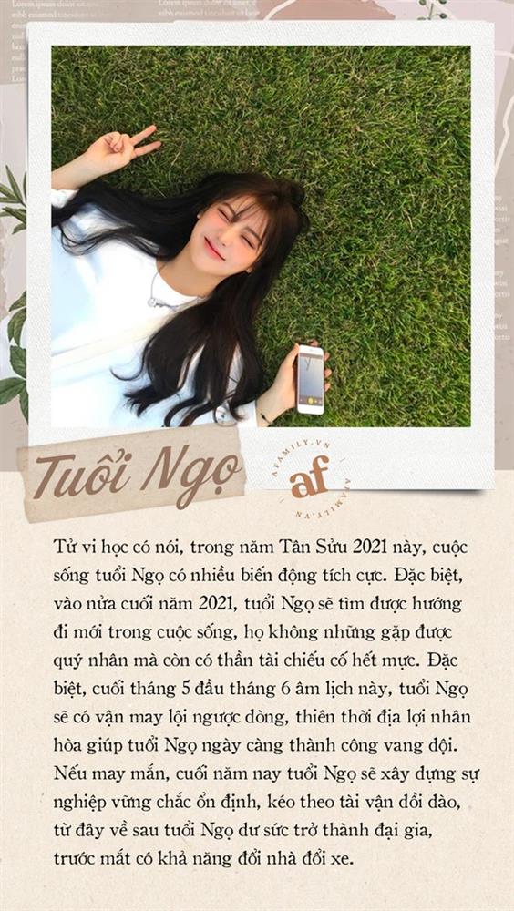 Tử vi học có nói, trong năm Tân Sửu 2021 này, cuộc sống tuổi Ngọ có nhiều biến động tích cực. Đặc biệt, vào nửa cuối năm 2021, tuổi Ngọ sẽ tìm được hướng đi mới trong cuộc sống, họ không những gặp được quý nhân mà còn có thần tài chiếu cố hết mực. Đặc biệt, cuối tháng 5 đầu tháng 6 âm lịch này, tuổi Ngọ sẽ có vận may lội ngược dòng, thiên thời địa lợi nhân hòa giúp tuổi Ngọ ngày càng thành công vang đội. Nếu may mắn, cuối năm nay tuổi Ngọ sẽ xây dựng sự nghiệp vững chắc ổn định, kéo theo tài vận dồi dào, từ đây về sau tuổi Ngọ dư sức trở thành đại gia, trước mắt có khả năng đổi nhà đổi xe.