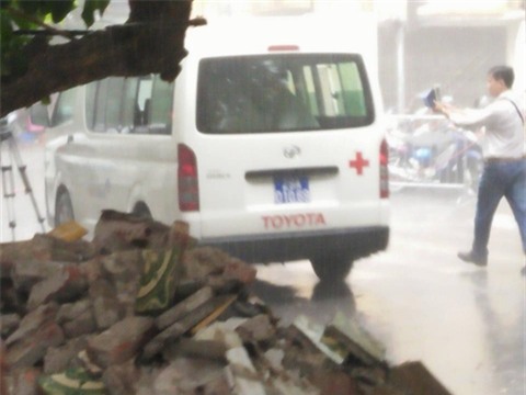 Chiếc xe cứu thương chở chị Nguyễn Thị Hằng đi trong mưa. |