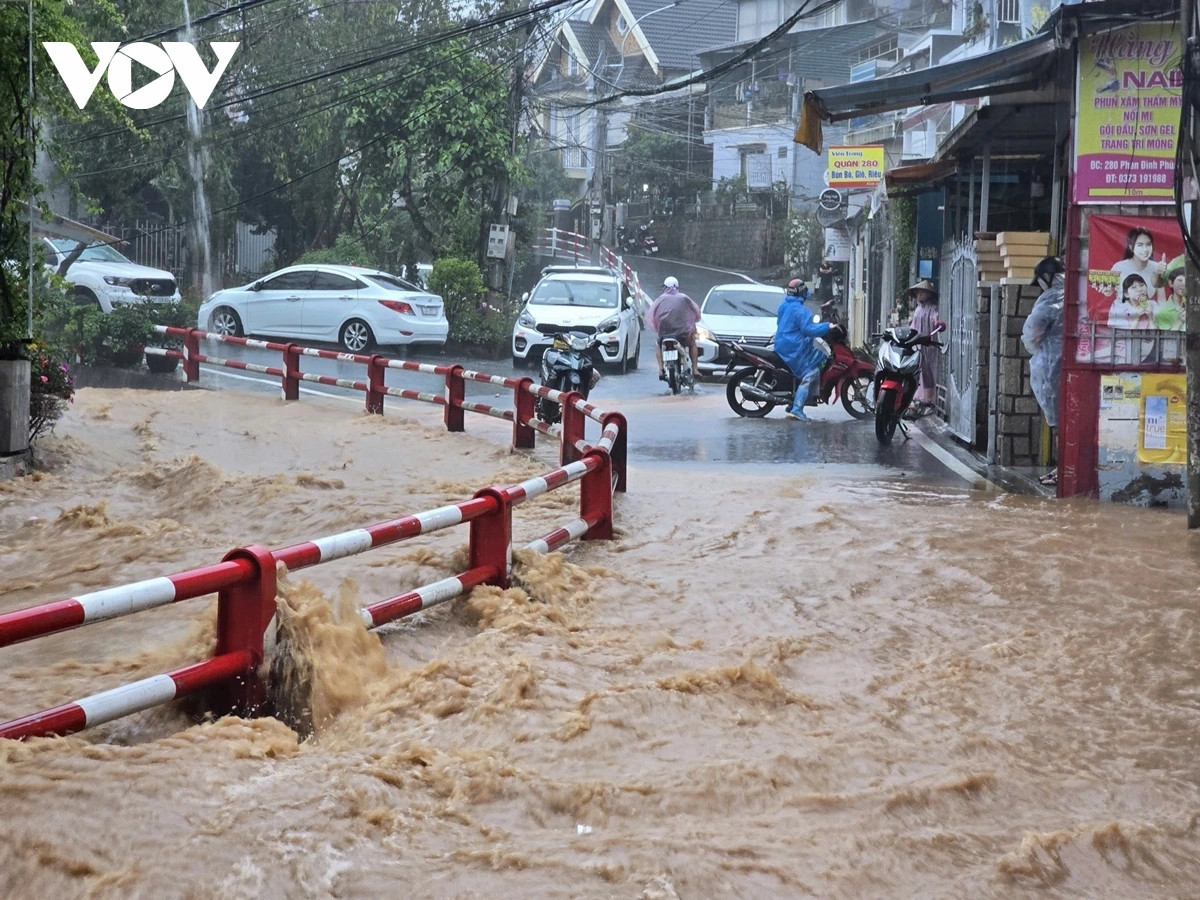 Cũng tại Đà Lạt, mưa lớn khiến một số khu vực ở phường Xuân Hương bị ngập cục bộ, lực lượng chức năng địa phương triển khai công tác phòng chống thiên tai, hỗ trợ người dân đi lại an toàn.