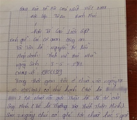 Trong lá đơn đầu tháng 3/2016 gửi cơ quan chức năng, chị Liễu nói rõ thủ đoạn của Hạnh lợi dụng việc chị Liễu lấy tiền của chùa, nếu không viết đơn theo chủ đích của Hạnh sẽ bị anh này tố cáo và phải ở tù. Đồng thời trong lá đơn, chị Liễu cũng cho biết, sư thầy Minh không bỏ thuốc mê hiếp dâm mình, không bỏ đói, ngược đãi mẹ con chị tại chùa như tố cáo sai sự thật trước đó.