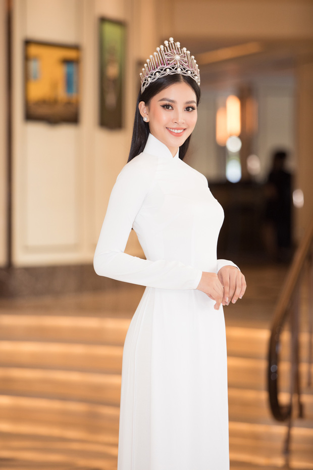 Tiểu Vy ngày càng nhuận sắc, cô xuất hiện với tà áo dài trắng trong buổi họp báo sáng nay.
