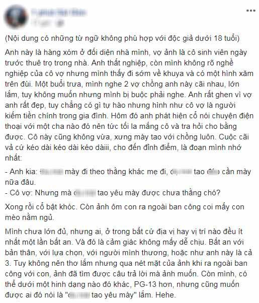 "Anh này là hàng xóm ở đối diện nhà mình. Vợ anh là cô sinh viên ngày trước thuê trọ trong nhà. Anh thất nghiệp, còn mình không rõ nghề nghiệp của cô vợ nhưng mình thấy đi sớm về khuya và có một hình xăm trên đùi.