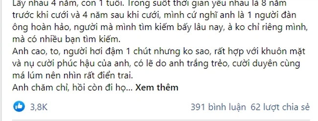 Mới đây, một cô vợ chia sẻ câu chuyện về cuộc hôn nhân cùng người chồng hoàn hảo. Hai vợ chồng cưới nhau 4 năm và có con đã 1 tuổi. Họ yêu nhau vào 8 năm trước, yêu được 4 năm thì kết hôn. Đây là người đàn ông mà cô luôn ao ước. Không chỉ cô mà ai cũng đánh giá chồng cô quá sức hoàn hảo, đáng để gắn bó cả đời.