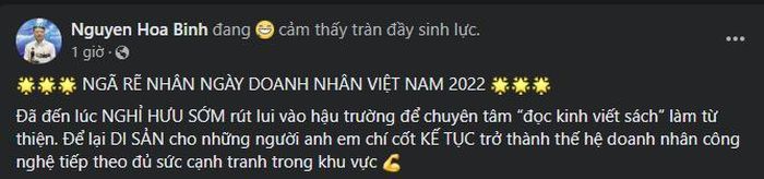 Cụ thể bài đăng của Shark Bình: "Đã đến lúc NGHỈ HƯU SỚM rút lui vào hậu trường để chuyên tâm “đọc kinh viết sách” làm từ thiện. Để lại DI SẢN cho những người anh em chí cốt KẾ TỤC trở thành thế hệ doanh nhân công nghệ tiếp theo đủ sức cạnh tranh trong khu vực".