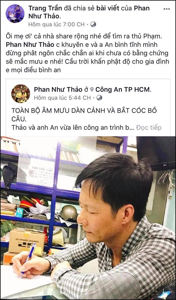 Nói về lý do chia sẻ sự việc lên mạng xã hội, mẹ Bồ câu muốn đánh động cho nhóm đối tượng biết là rất nhiều người biết chuyện này, để họ không dám manh động. Vợ chồng doanh nhân Đức An quyết giải quyết vụ việc đến cùng. Hiện tại, Phan Như Thảo không dám cho bé Bồ Câu ra đường.