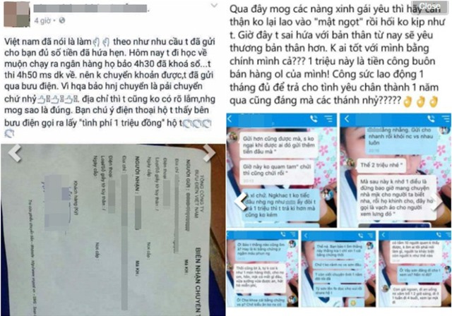 Qua đây mong các nàng xinh gái yêu thì hãy cẩn thận không lại lao vào "mật ngọt" rồi hối không kịp như mình. 1 triệu này là tiền công buôn bán hàng online của mình. Công sức lao động một tháng đủ để trả cho tình yêu chân thành 1 năm qua".