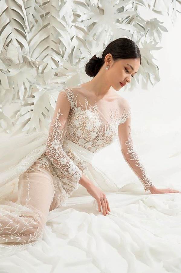 Á hậu Việt Nam 2016 diện váy cưới trắng muốt, chất liệu xuyên thấu khoe vòng một gợi cảm trong bộ ảnh thời trang mới.