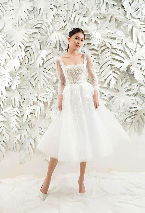 Thiết kế váy cưới dáng chữ A tưởng đơn giản nhưng vẫn vô cùng kiêu sa, giúp cô dâu toả sáng trong tiệc cưới.