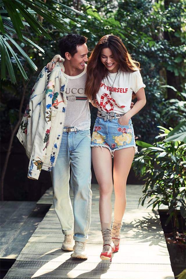 Hà Hồ diện đồ Gucci chẳng phải chuyện gì quá xa lạ nhưng thú vị ở chỗ cô lại mặc ngay chiếc áo mà Kim Lý vừa mặc cách đây không lâu. Cả hai thực hiện bộ ảnh đầu tiên sau khi công khai hẹn hò. Cả Kim Lý và Hà Hồ đều chọn những thiết kế hiệu Gucci đẳng cấp với cách kết hợp vừa chất vừa đồng điệu cùng nhau.