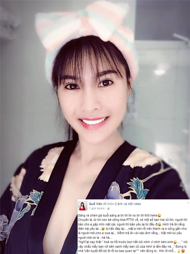 Theo đó, nữ ca sĩ Hà Thành tiết lộ nhận được nhiều lời tỏ tình từ những người cũ. "Chuyện là từ khi con bé công khai phẫu thuật thẩm mỹ về, có một số bạn trai cũ tìm. Người thì bảo cho anh gặp nhìn mặt cái, người thì bảo yêu lại từ đầu đi", Quế Vân viết. Tuy nhiên, một cách kiên quyết Quế Vân đã lắc đầu từ chối thẳng thừng lời gạ gẫm. Để rõ ràng quan điểm, nữ ca sĩ cho biết "mặt mới nên phải yêu người mới".