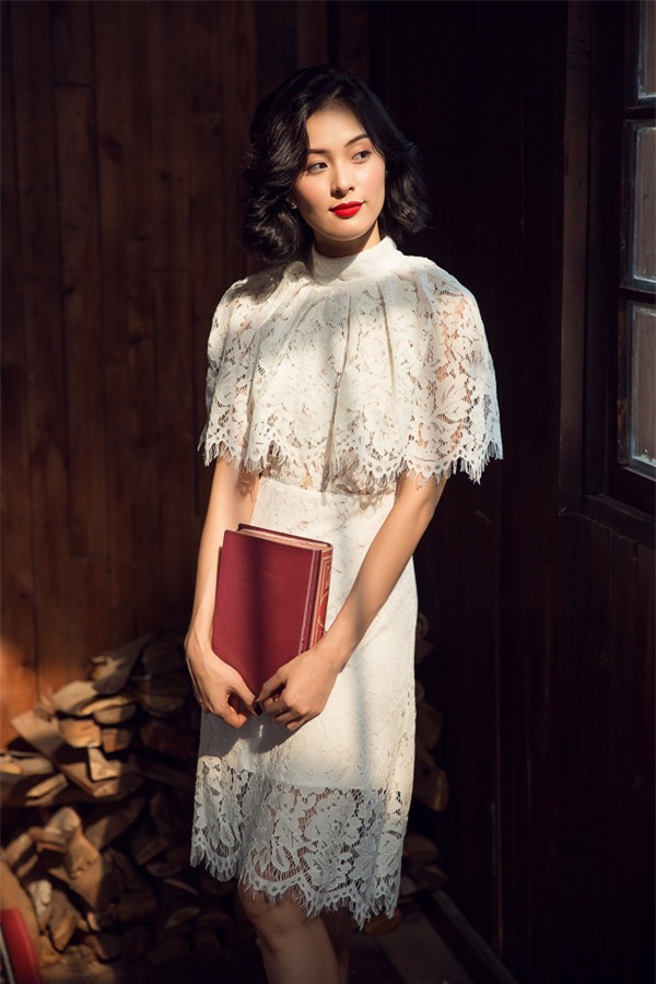 Hạ Vi hóa quý cô kiêu kỳ với váy ren được xếp ly rất tinh tế. Son đỏ chót càng tôn thêm vẻ đẹp mong manh của mỹ nhân sinh năm 1993