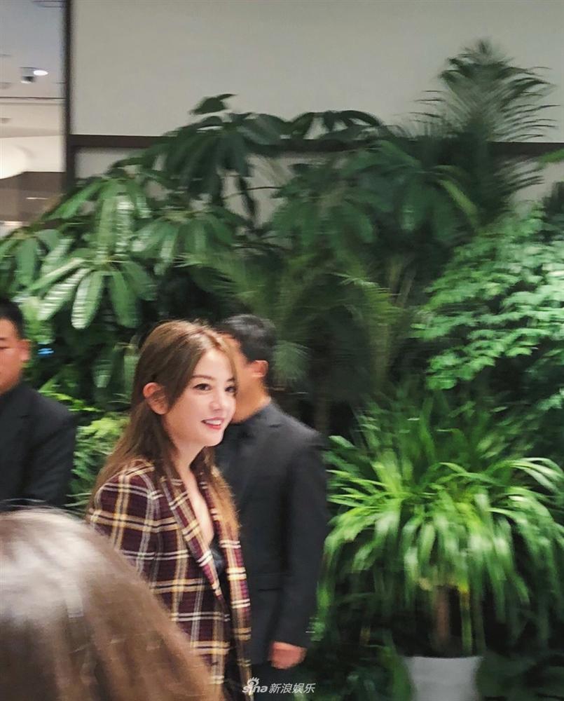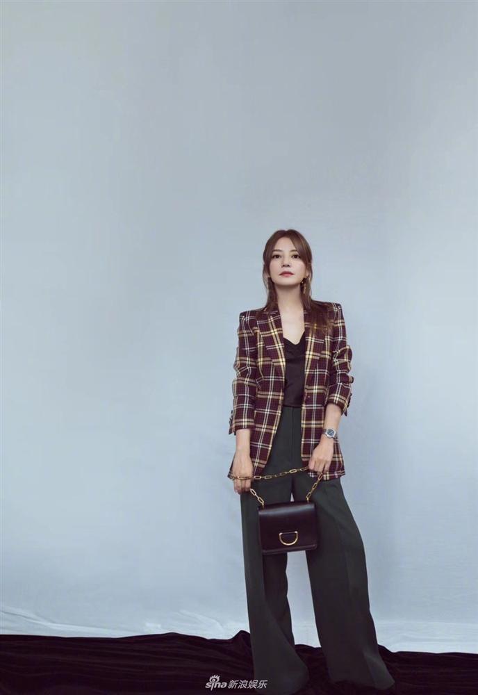 Không váy áo bánh bèo lộng lẫy, Triệu Vy lựa chọn phong cách doanh nhân thành đạt với áo blazer kẻ caro kết hợp quần ống rộng. Nàng "Én nhỏ" nhấn nhá set đồ bằng phụ kiện đồng hồ và túi xách tông đen cơ bản. Trang phục tinh tế đem đến cho nữ diễn viên vẻ sang chảnh, tươi trẻ ở tuổi 42.