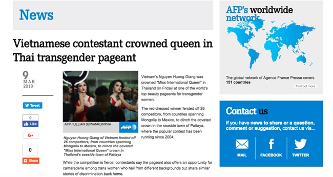 Tờ AFP nổi tiếng thế giới cũng có một bài viết riêng với nhan đề: "Thí sinh Việt Nam giành vương miện trong cuộc thi Hoa hậu chuyển giới tại Thái". Tờ AFP còn có dòng viết: "Người đẹp trong trang phục đỏ đã chiến thắng 26 thí sinh đến từ Mông Cổ trải dài đến Mexico để chiến thắng cuộc thi được tổ chức tại Pattaya"