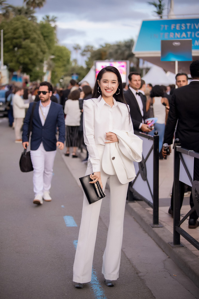 Trong sự kiện đầu tiên tại Cannes, Nhã Phương mặc vest trắng kết hợp áo sơ mi và quần âu cùng tông. Nữ diễn viên rạng rỡ, lấy lại nhan sắc xinh đẹp và thần thái của mình sau một khoảng thời gian mệt mỏi vì scandal tình ái của Trường Giang với Nam Em, Khánh My.