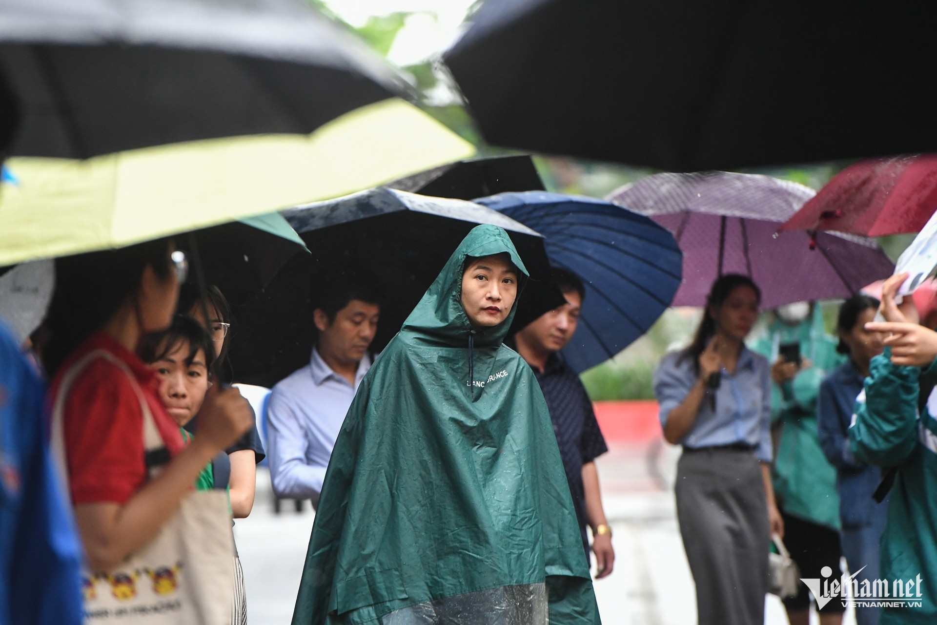 9h50, các phụ huynh xếp hàng, hồi hộp chờ đợi sĩ tử bước ra khỏi cổng trường sau môn thi đầu tiên.
