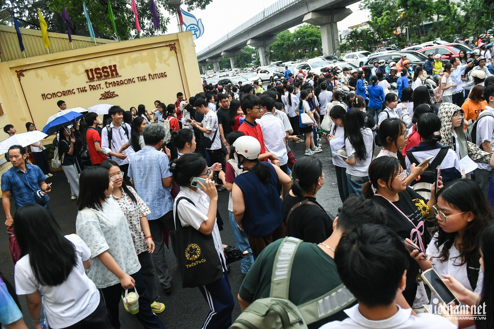 Nhiều thí sinh vừa đi vừa trao đổi thêm với các bạn. Lãnh đạo Trường THPT Chuyên Khoa học Xã hội và Nhân văn cho biết, năm nay, có 2.037 thí sinh đăng ký dự thi vào trường. Khối chuyên Văn có tỷ lệ chọi khoảng 1/17; khối chuyên Sử là 1/14 và khối chuyên Địa là 1/13.