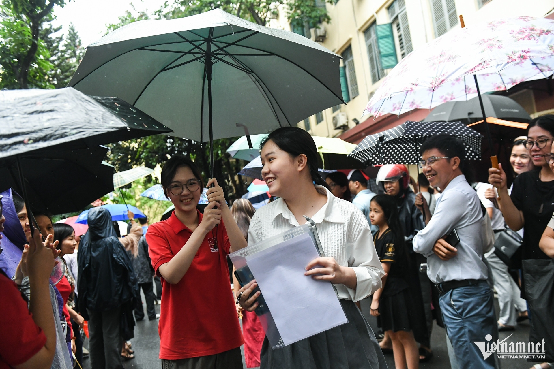Tiến Thịnh (THCS Giảng Võ) tự tin bước đi, vẫy tay chào các phụ huynh và bạn bè. "Em tới đây để xem á khoa là ai chứ em thủ khoa chắc chắn là em đây rồi", nam sinh cười. Câu khẳng định hài hước của cậu khiến các bậc phụ huynh cạnh đó bật cười và thở phào nhẹ nhõm.