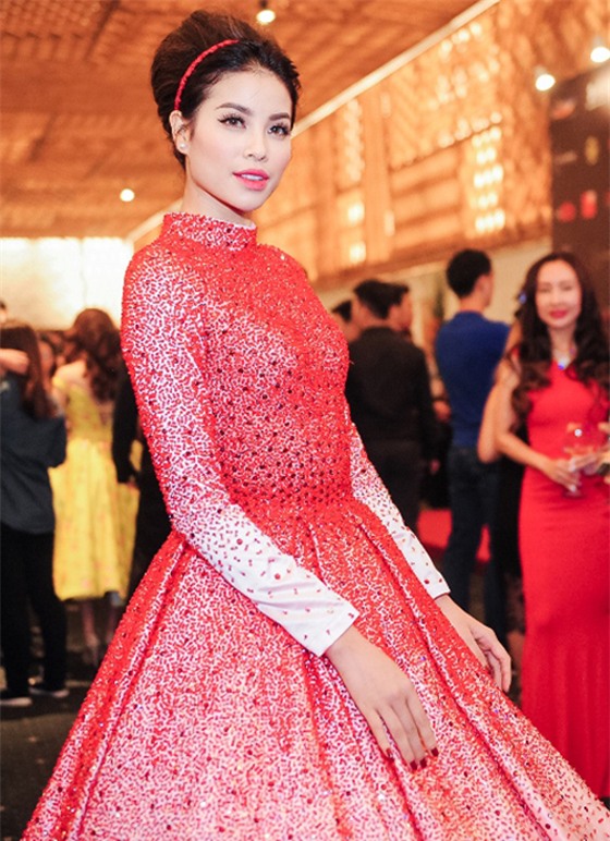 tại một sự kiện diễn ra tại thành phố Hồ Chí Minh. Cô diện váy màu đỏ