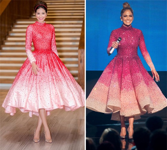 Hình ảnh Phạm Hương và Jennifer Lopez trong hai chiếc váy khá giống nhau.