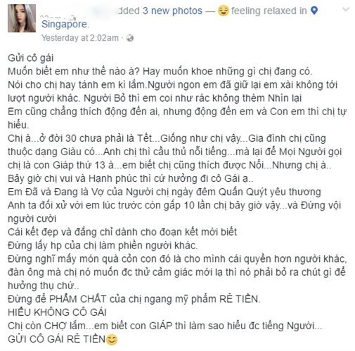 Trước đó, vào hồi đầu tháng 6, bức xúc trước hành động và thái độ của Khánh Chi, người vợ đã lên trang cá nhân bày tỏ sự phẫn nộ: “Chị à… ở đời 30 chưa phải là Tết… Giống như chị vậy… Gia đình chị cũng thuộc dạng giàu có… Anh chị thì cầu thủ nổi tiếng… mà lại để mọi người gọi chị là con Giáp thứ 13 à… Em biết chị cũng thích được nổi… Nhưng chị à… Cái kết đẹp và đắng chỉ dành cho đoạn kết mới biết. Đừng lấy hạnh phúc của chị làm phiền người khác”.