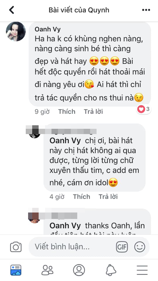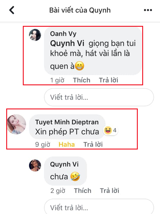 Cùng "hội ngộ" trong một status nhưng có lẽ Minh Tuyết không để tâm đến bình luận củaVy Oanh. Cô chỉ "nhắc nhẹ" đồng nghiệp của mình nên xin phép nhạc sĩ trước khi hát ca khúc này.