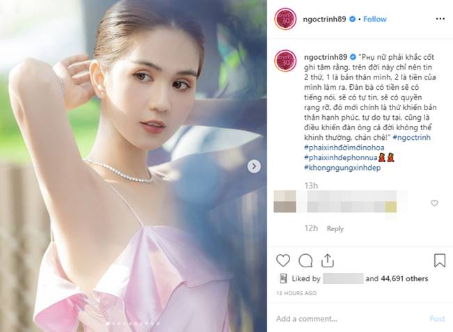Mới đây, "nữ hoàng nội y" Ngọc Trinh đã đăng tải lên trang cá nhân triết lý của mình và cũng là lời khuyên với các cô gái với nội dung: "Phụ nữ phải khắc cốt ghi tâm rằng, trên đời này chỉ nên tin 2 thứ, 1 là bản thân mình, 2 là tiền của mình làm ra. Đàn bà có tiền sẽ có tiếng nói, sẽ có tự tin, sẽ có quyền rạng rỡ, đó mới chính là thứ khiến bản thân hạnh phúc, tự do tự tại, cũng là điều khiến đàn ông cả đời không thể khinh thường, chán chê!".