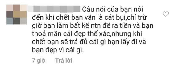 Một số bình luận chỉ trích dưới bài đăng của Ngọc Trinh: "Nhan sắc hỗ trợ bạn nhưng không quyết định tất cả. Chẳng ai muốn lấy một cô gái não ngắn về làm vợ cả", "Nhan sắc không quyết định tất cả đâu chị, chẳng qua chị sống trong cuộc sống màu hồng mới thấy thế thôi"; "Nhan sắc rồi cũng sẽ tàn phai theo năm tháng, chỉ có những người con gái có nhân cách và đức hạnh mới được yêu thương thôi",...