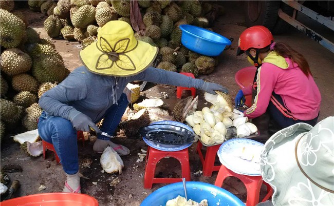 Theo tìm hiểu của chúng tôi, trước đây người trồng sầu riêng thường tự thu hái trái đem bán cho thương lái. Nhưng những năm gần đây, thương lái không đợi dân mang hàng đến bán nữa mà thường đến tận vườn đặt cọc khi sầu riêng chỉ vừa ra trái non. Khi đến thời điểm thu hoạch, họ tự cho người đến thu hái sau đó cân lên và trả tiền cho chủ vườn.