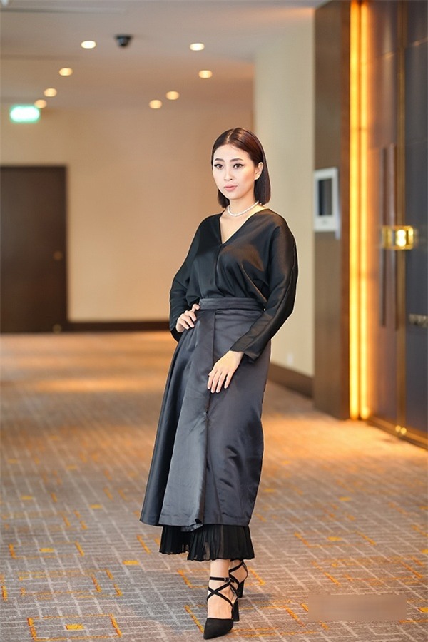 MC Liêu Hà Trinh như hóa quý bà bởi váy áo màu đen được thiết kế trên chất liệu bắt sáng già chát. Khi diện đồ đen, các nàng nên tránh những kiểu đồ quá bóng vì nó khiến bạn già đi cả chục tuổi.