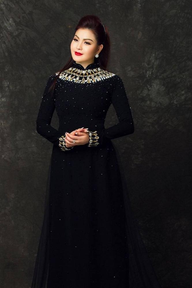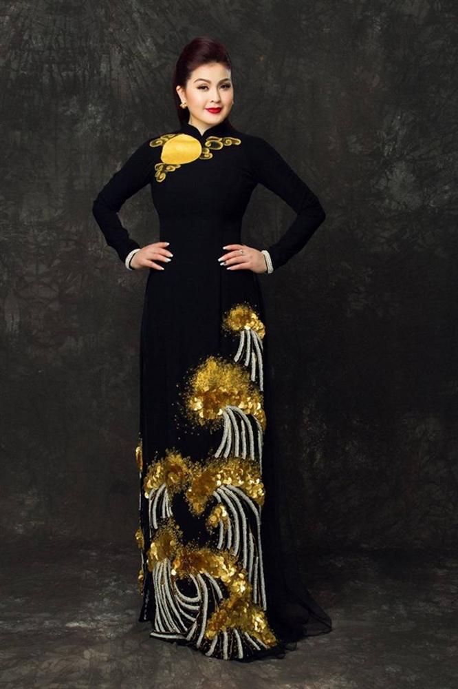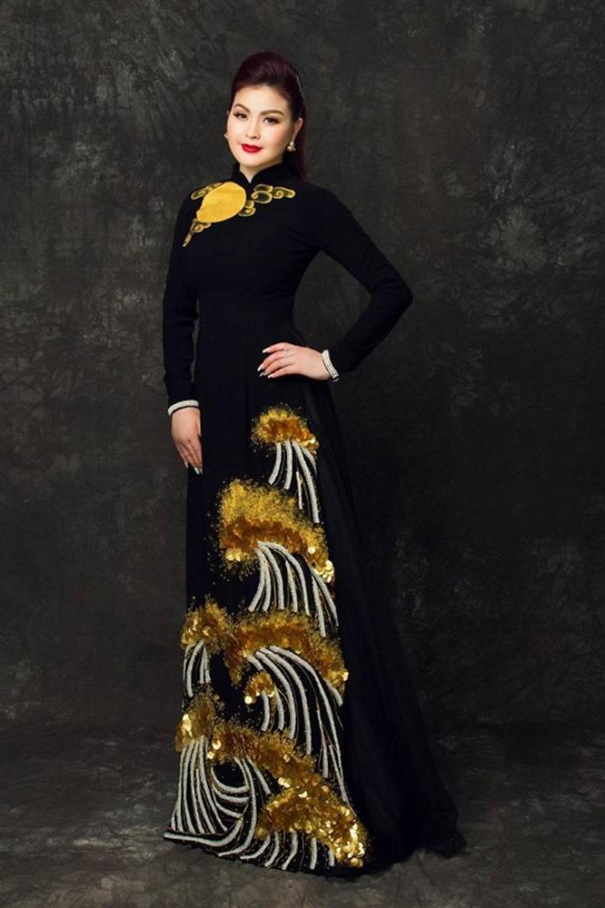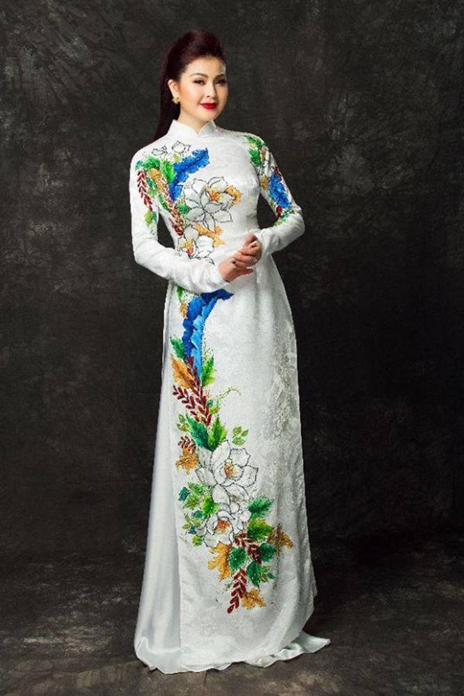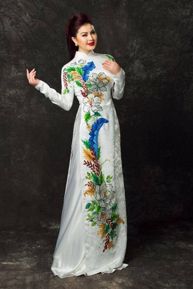 Yến Vy diện trang phục áo dài phom truyền thống được thêu họa tiết dọc thân, đính kết hạt cườm quanh hoa văn. Với họa tiết hoa sen đính các hạt đá cùng tông màu, tạo độ bắt sáng khi di chuyển Yến Vy cực kỳ yêu thích. Yến Vy thổ lộ, cô thích những thiết kế của đàn em vì vẫn giữ phom truyền thống như cổ trụ, chít eo...