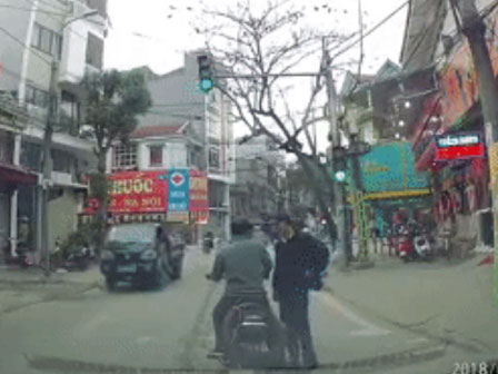 Theo những gì được ghi lại từ camera hành trình thì một người đàn ông đi xe máy bỗng nhiên dừng đỗ giữa đường, chờ một người đàn ông khác lững thững đi tới. Hai người tay bắt mặt mừng, trò chuyện hàn huyên vui vẻ ngay giữa đường như thể xung quanh không có ai.